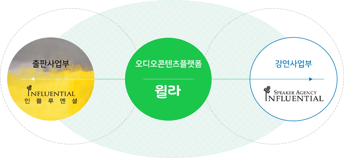 인플루엔셜은 출판, 강연, 오디오콘텐츠 플랫폼 윌라가 연결되어 시너지를 내는 지식 콘텐츠 기업입니다.